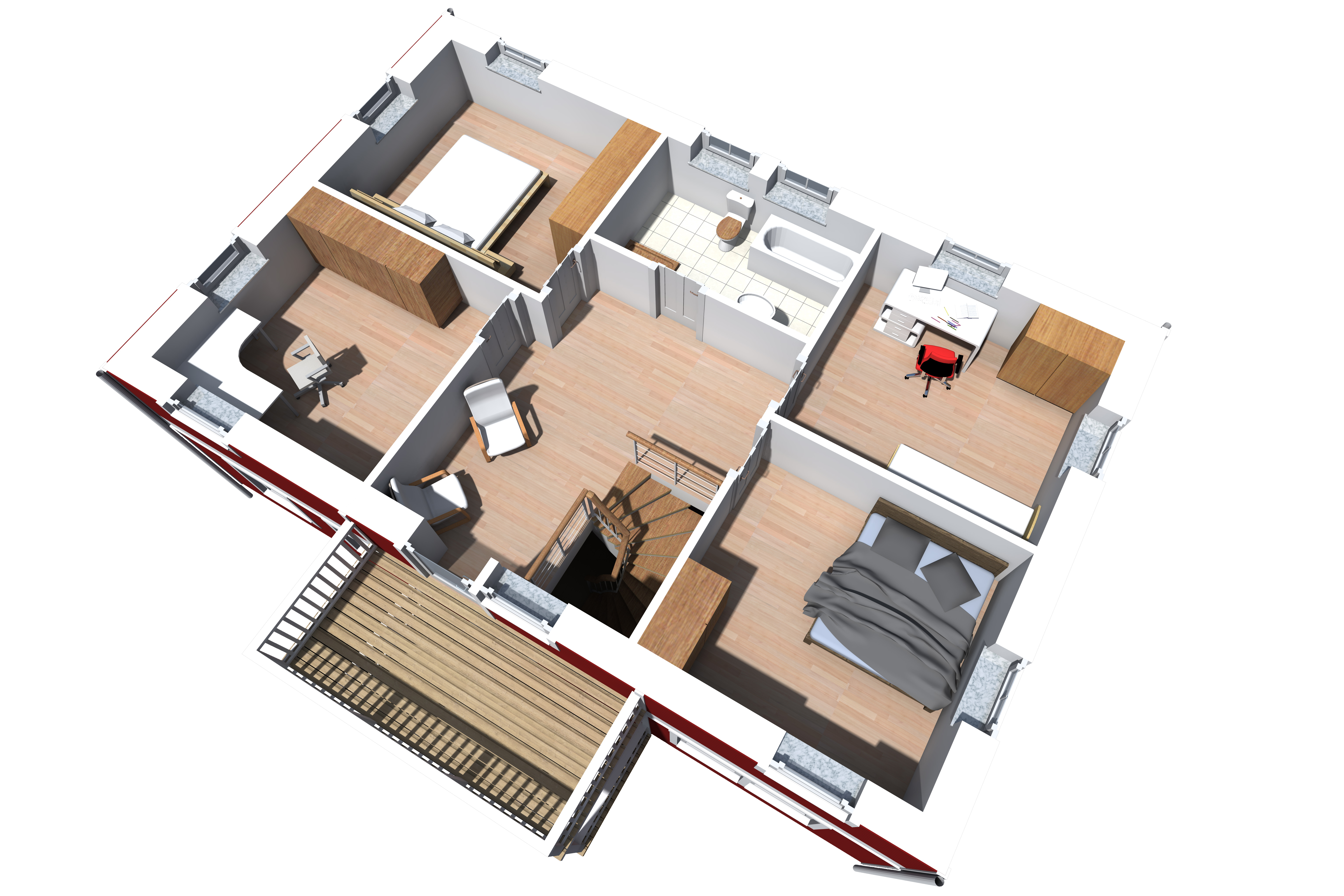 Dieses schwedische Landhaus besticht durch seine symmetrischen Proportionen. Der vorgesetzte Eingang mit Balkon verleiht dem Haus eine besondere Note. Viele Fenster bringen Tageslicht ins Haus. Der gut durchdachte Grundriss gibt genügend Platz für eine vierköpfige Familie. Der offene Grundriss im Erdgeschoss sorgt für ein großes Raumgefühl, welches oft nur in viel größeren Häusern vorhanden ist. Das Modell Nordkap 150 hat zusätzlich ein Gästebad und mit dem Schlafzimmer im Erdgeschoss wird später ein Wohnen auf einer Ebene ermöglicht. Dann haben die Kinder das Obergeschoss für sich.
