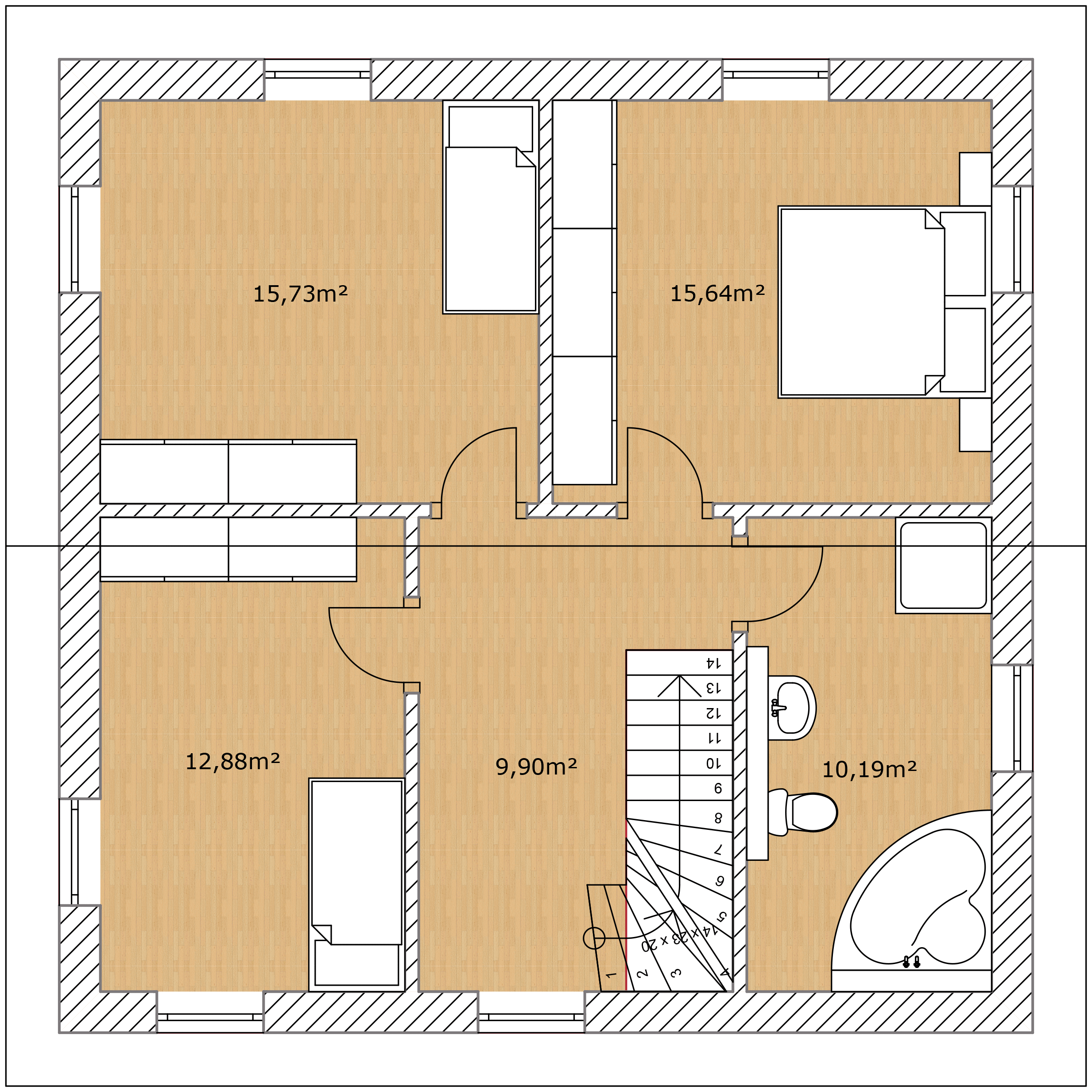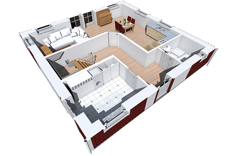 Das war die Maxime bei diesem Grundriss. Denn von den Abmessungen her passt dieses hübsche Schwedenhaus auch auf etwas kleinere Grundstücke z. B. in der Stadt. Das Haus bietet im Erdgeschoss eine offene Küche und einen großzügigen Essplatz zum Wohnzimmer hin. Durch die Terrassentüren gelangen Sie in den Garten. Wie es in Schweden üblich ist, gibt es auch bei der Nordkap Stadtvilla ein Bad mit Badewanne als auch ein Bad mit Dusche.